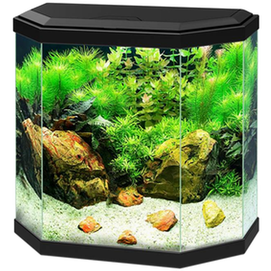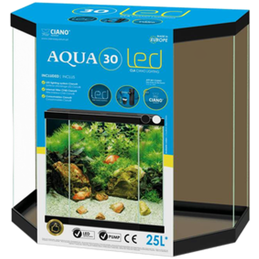 Svart akvarium. Med perfekta & tuffa sexkantiga ytor utmärker Aqua 30 sin elegans & säkerhet, med stötskyddande plastramar, polerade hörn & gångjärnslock. För enkelt underhåll är Aqua 30 utrustad med CF40 Ciano internt filtreringssystem, optimerat för reducerad fiskstress & med en sprutstång som möjliggör en jämnare fördelning av vatten & ökad syresättning. Aqua 30 har CLA20 Ciano-belysning, ett certifierat lågspänningsbelysningssystem för total säkerhet, vilket garanterar naturlig belysning & låg energiförbrukning.