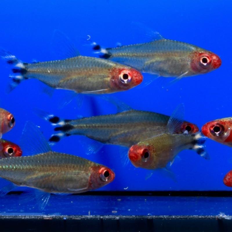 Rödmunstetra en vacker akvariefisk med röd mun silverfärgad kropp, svartvita stjärt, allätare. Akvariefisk hålls i stimm. Sprider romen. Rödmunstetra latinska namn: Hemigrammus rhodostomus, ursprung: Sydam., temp:22-28, pH :6.0-8.0 dH :5-AI7813