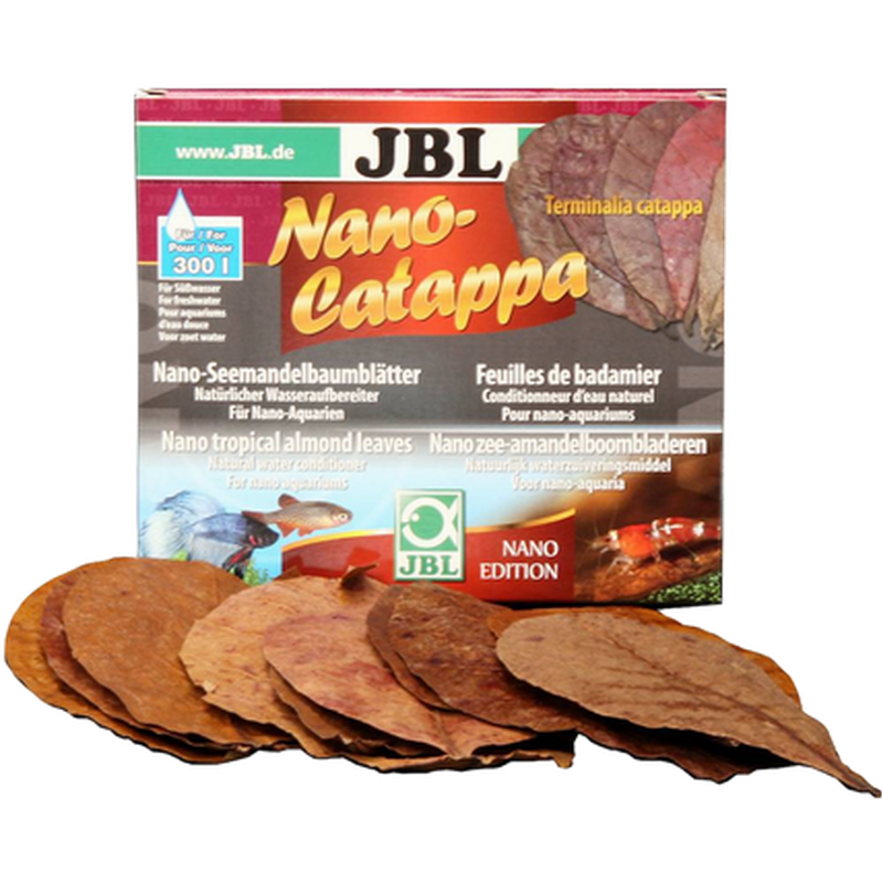 JBL Nano-Catappa löv från det tropiska mandelträdet (Terminalia Catappa) löven är kända för sin läkande effekt på fisk och räkor: JBL Nano-Catappa sänker bakterietrycket (färre protogener), förhindrar svampinfektioner, förbättrar tillväxt, förhindrar problem med slemskiktet och stimulerar lekvillighet, livskraft och färg hos räkor och fiskar. Dosering: 1 st löv till 15 till 30 liter akvarievatten bladets aktiva substans tar det ca 3 veckor innan allt har löst ut ifrån bladet.