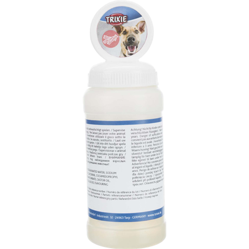 Tvålvatten med baconarom som lockar till lek. Det är ofarligt för din hund att svälja mindre mängder under lekens gång. Trixie Bacon Bubbles 120ml