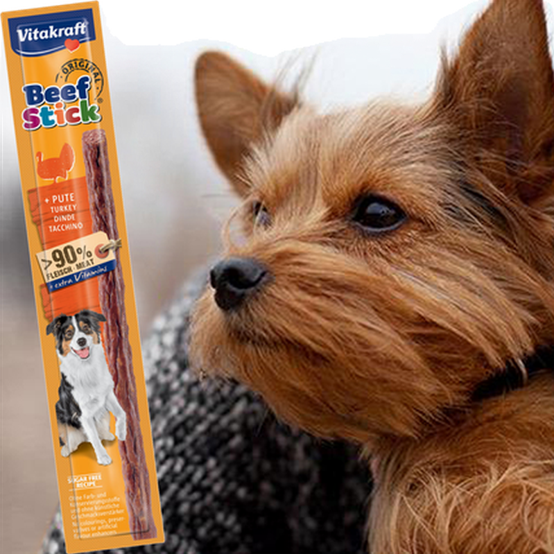 Hundgodis salamikorv med kalkon även för den kräsna hunden. Vitakraft Beef-stick salami är mjuka brytbara tuggstänger med hög kötthalt (90%), vitaminberikade, sockerfritt, utan färgämnen och konserveringsmedel. Vitakrafts populära köttsticks har en smart förpackning som håller tugg