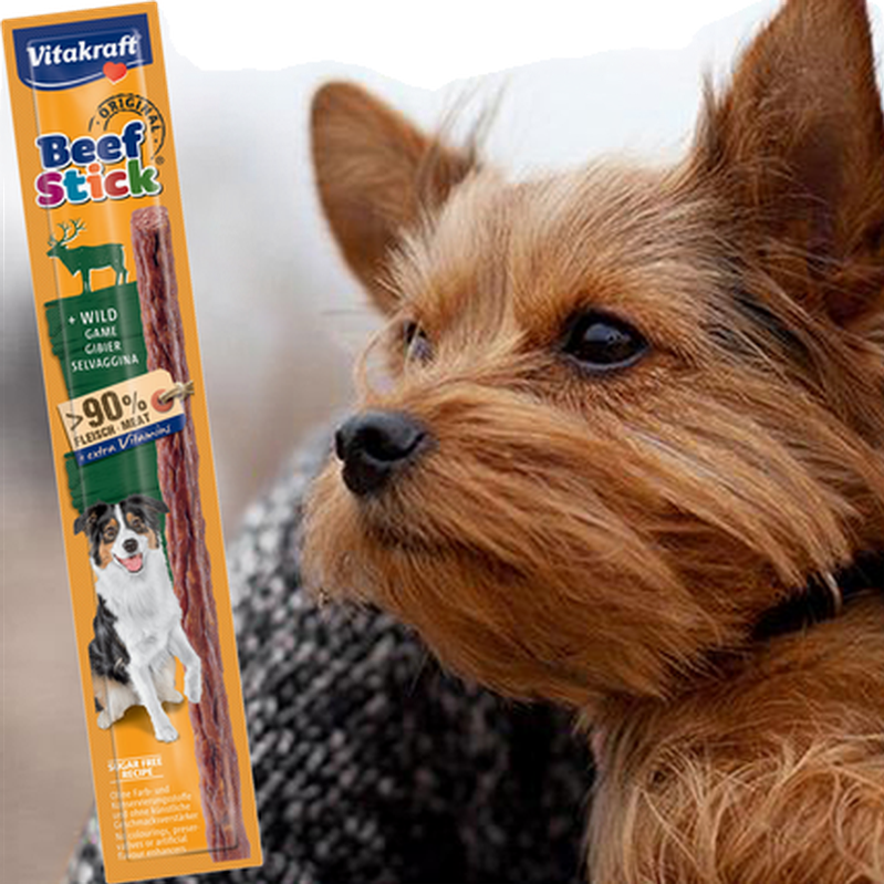 Hundgodis salamikorv med vilt även för den kräsna hunden. Vitakraft Beef-stick salami är mjuka brytbara tuggstänger med hög kötthalt (90%), vitaminberikade, sockerfritt, utan färgämnen och konserveringsmedel. Vitakrafts populära köttsticks har en smart förpackning som håller tugg