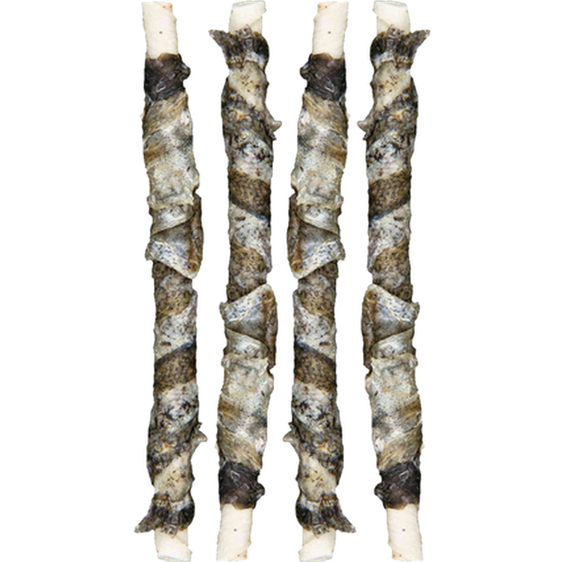 Smaskiga hundben med tuggmotstånd. Vita råhudsben inlindade med torkad fiskfilé. Tuggpinnar med extra tjock råhud för längre tuggupplevelse. Trixie DentaFun Chewing Rolls with Fish.