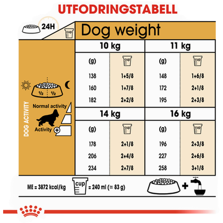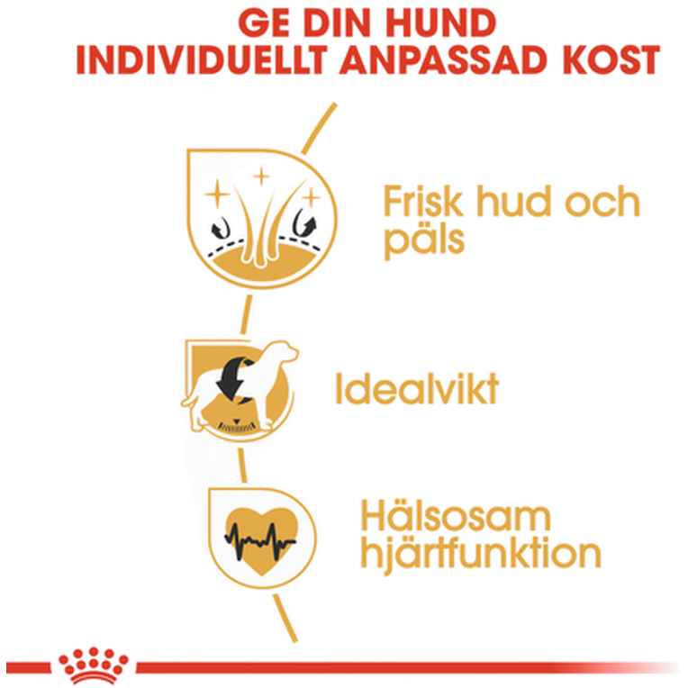 Ris, majs, torkat fågelprotein, majsgluten, animaliskt fett, hydrolyserat animaliskt protein, betmassa, vegetabiliskt proteinisolat*, fiskolja, mineraler, psylliumfrön/skal, sojaolja, frukto-oligosackarider, jästhydrolysat (innehåller mannan-oligosackarider), boragoolja (0,1 %), skaldjurshydrolysat (innehåller glukosamin), mjöl av ringblomma, hydrolysat från brosk (innehåller kondroitin).