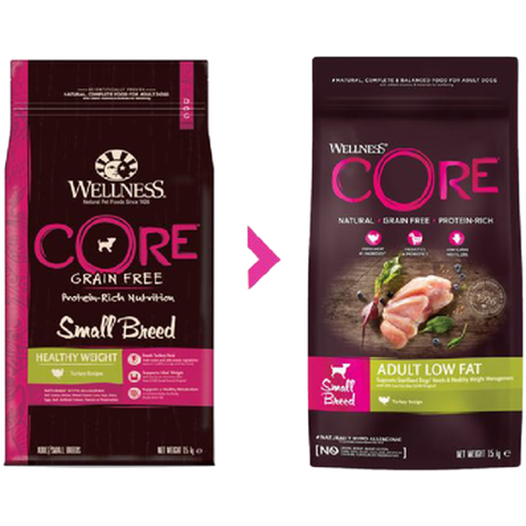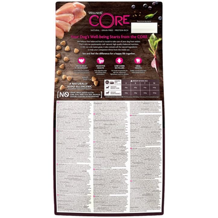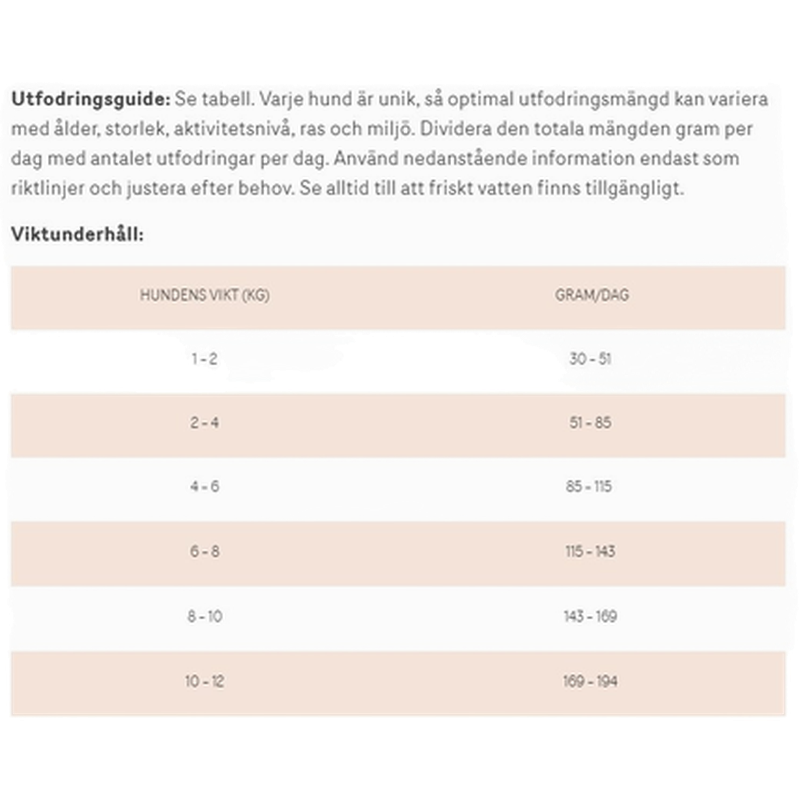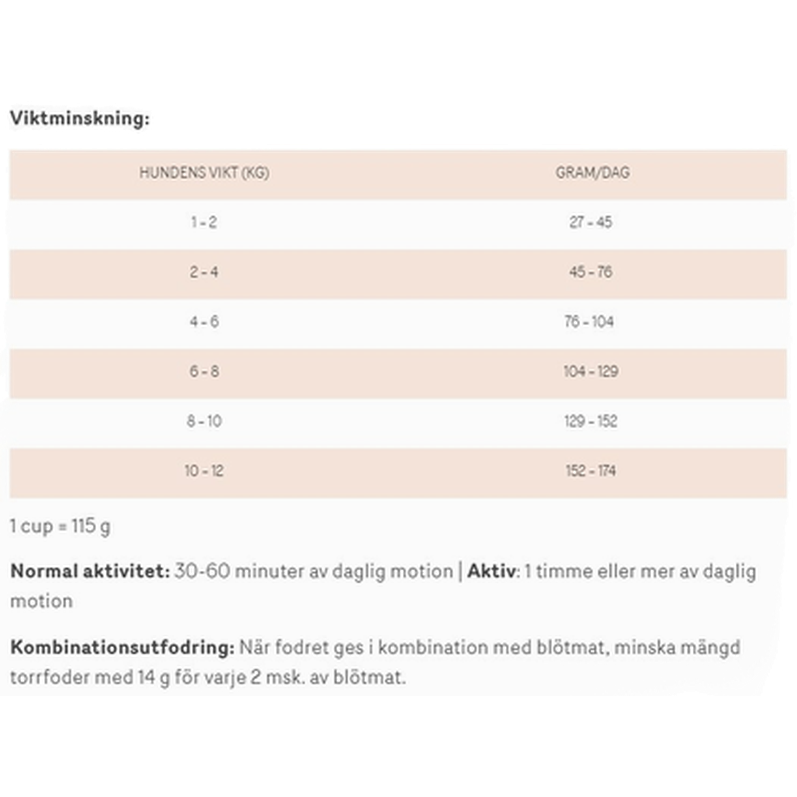 Kalkon 29 % (färsk kalkon 17 %, torkad kalkon 12 %), kyckling 24 % (torkad kyckling 17 %, kycklingsås 5 %, kycklingfett 2 %), torkad potatis, ärtor, betmassa 4 %, potatisprotein, helfet linfrö, cellulosa, laxolja 1 %, morötter, äpplen, torkad cikoriarot 0,5 % (källa till FOS och inulin), jästextrakt 0,5 % (källa till mannanoligosackarider), broccoli, spenat, tomater, blåbär, tranbär, glukosaminhydroklorid 100 mg/kg, kondroitinsulfat 100 mg/kg, Yucca schidigera.