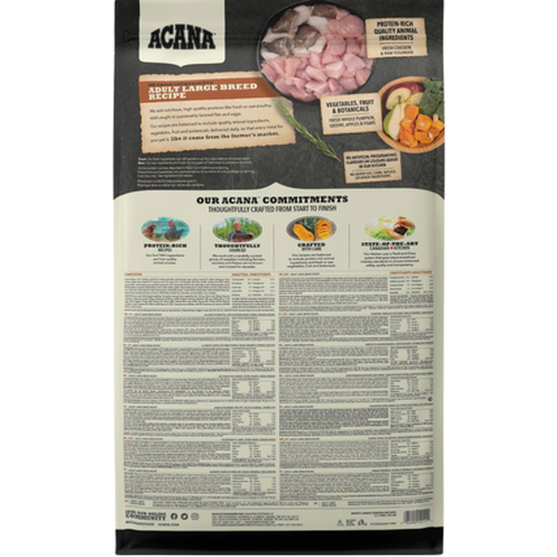 Färsk kyckling (16 %), torkat kycklingkött (15 %), hela röda linser, hela gröna ärtor, torkat kalkonkött (7%), hela kikärtor, färska kycklinginälvor (lever, hjärta) (4 %), kycklingfett, färska ägg(4 %), rå kummel (4 %), fiskolja (3 %), torkad sill (2,5 %), hela gröna linser, hela gula ärtor, kikärtsfiber, ärtstärkelse, rå kalkonlever (0,5 %), salt, torkad kelp, färsk hel pumpa, färsk hel butternutsquash, färska hela morötter, färska hela äpplen, färska hela päron, färsk hel zucchini, torkad cikoriarot, färsk grönkål, färsk spenat, färska majroveblad, färska rödbetsblad, hela tranbär, hela blåbär, hela saskatoonbär, gurkmeja, mjölktistel, kardborrerot, lavendel, läkemalva, nypon.