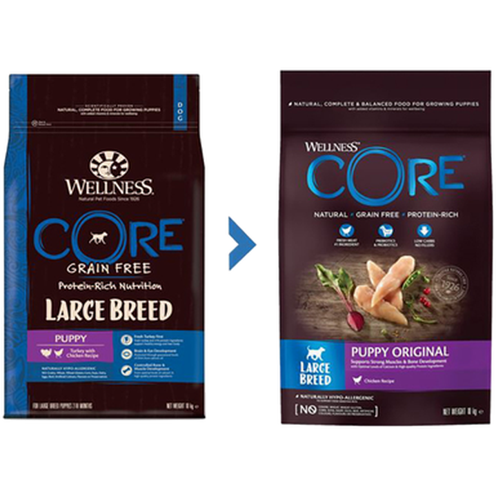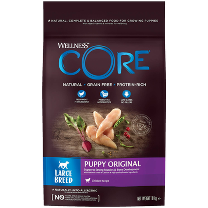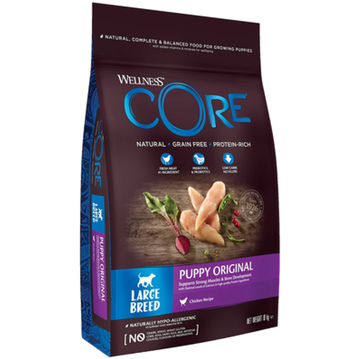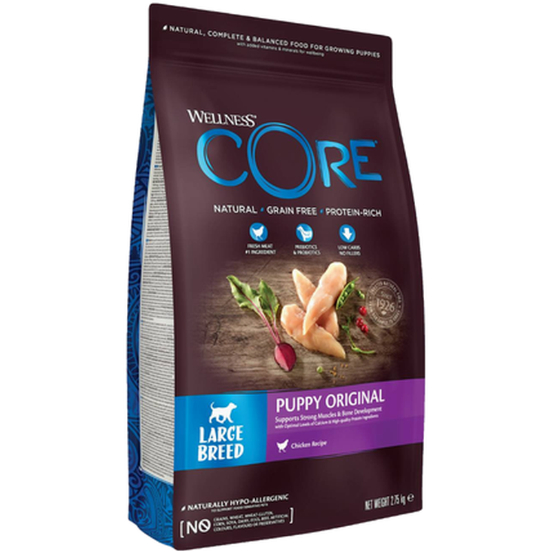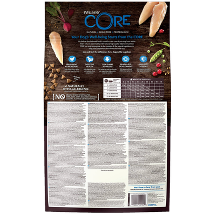 Kyckling 61 % (färsk kyckling 25 %, torkad kyckling 20 %, kycklingfett 6 %, torkat kycklingprotein 5 %, kycklingsås 5 %), ärtor, torkad potatis, betmassa 4 %, helfet linfrö, laxolja 2 %, morötter, äpplen, torkad cikoriarot 0,5 % (källa till FOS och inulin), jästextrakt 0,5 % (källa till mannanoligosackarider), broccoli, tomater, spenat, tranbär, blåbär, glukosaminhydroklorid 100 mg/kg, kondroitinsulfat 100 mg/kg, Yucca schidigera.