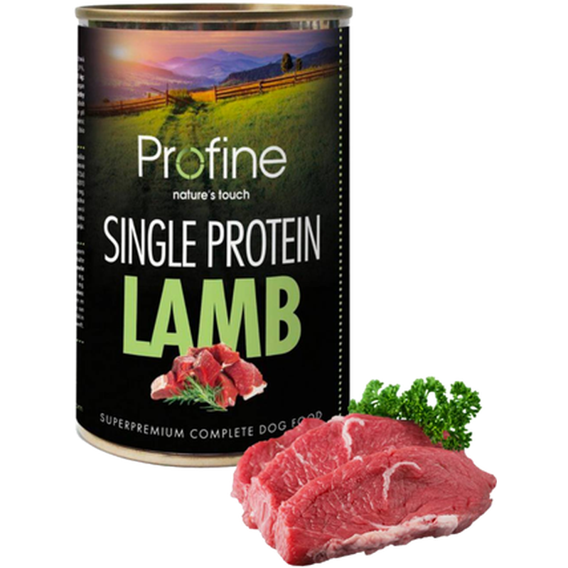 Våtfoder - singelprotein med lamm som enda proteinkälla. Hundmat som även lämpar sig för känsliga & allergiska hundar. Fodret tillverkas av naturliga ingredienser av högsta kvalitét - helt utan onödiga tillsatser. Kan serveras som helfoder eller som topping för riktigt kräsna hundar. Profine Dog Single Protein Lamb