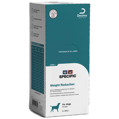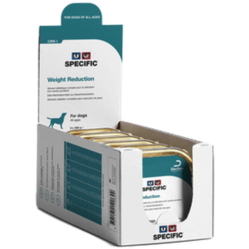 Viktminskning burk hundfoder - Våtmat till hundar från Specific. Viktminskningsfoder för överviktiga hundar i alla åldrar. Bantningsfoder från Specific lämpligt för hundar med diabetes, tjocktarmsinflammation, kronisk diarré och förstoppning. Veterinärfoder med lågt innehåll av fett och kalorier, men hög halt fibrer och protein gör att du kan ge din hund en stor mängd smakligt foder, för att tillfredsställa dess aptit, samtidigt som du hjälper den att gå ner i vikt. Våtfoder för vuxna hundar som behöver gå ner I vikt. Specific™ Dogs CRW-1 Weight Reduction Wet