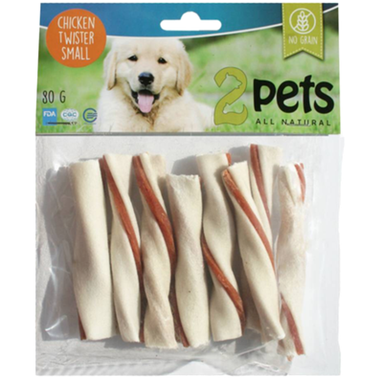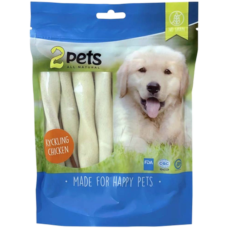 Hundgodis med kyckling. Goda tuggpinnar med kycklingkött. Smakrikt hundtugg som hjälper till att rengöra tänderna. Kycklingköttet är gömt inuti tuggbenet vilket gör att hunden får jobba mer för att komma åt det. 2pets Tuggtwister Chicken