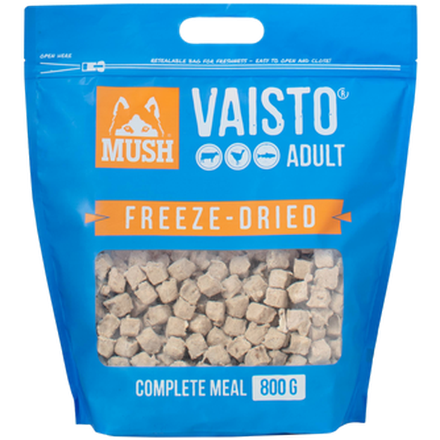 Mush Vaisto Blå Freeze-Dried är ett frystorkat färskfoder med nöt, kalkon & lax som passar alla hundar, även den känsliga. Hundmaten har samma höga näringsvärde & kvalitet som vanligt råfoder, men tack vare att fodret är frystorkat i bitar har det lägre vikt. Skonsam tillverkningsmetod bevarar köttets smak- & näringsämnen. Smidiga påsar som väger lite, perfekt att ta med på resor, utställning, tävling eller vandring. Även bra som naturligt hundgodis vid träning. Lättsmält & kalorisnålt foder för vuxna hundar i alla storlekar & raser. Mush Vaisto Blå Nöt-Kalkon-Lax Frystorkat