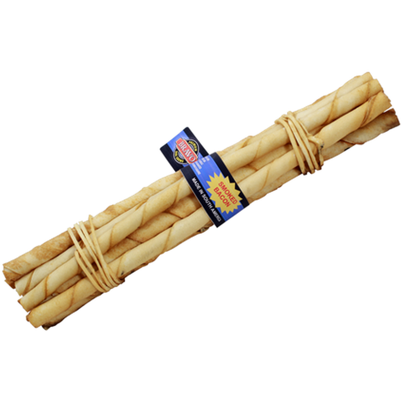 Smaksatt kvalitetstugg med härlig smak av Bacon. Smala sydamerikanska premium hundtugg av högsta klass. Bravo råhudstugg 10-pack är smala vridna tuggpinnar. Tuggben med baconsmak för små & stora hundar. Bravo tuggpinnarna har en hög kvalitet på råvarorna.