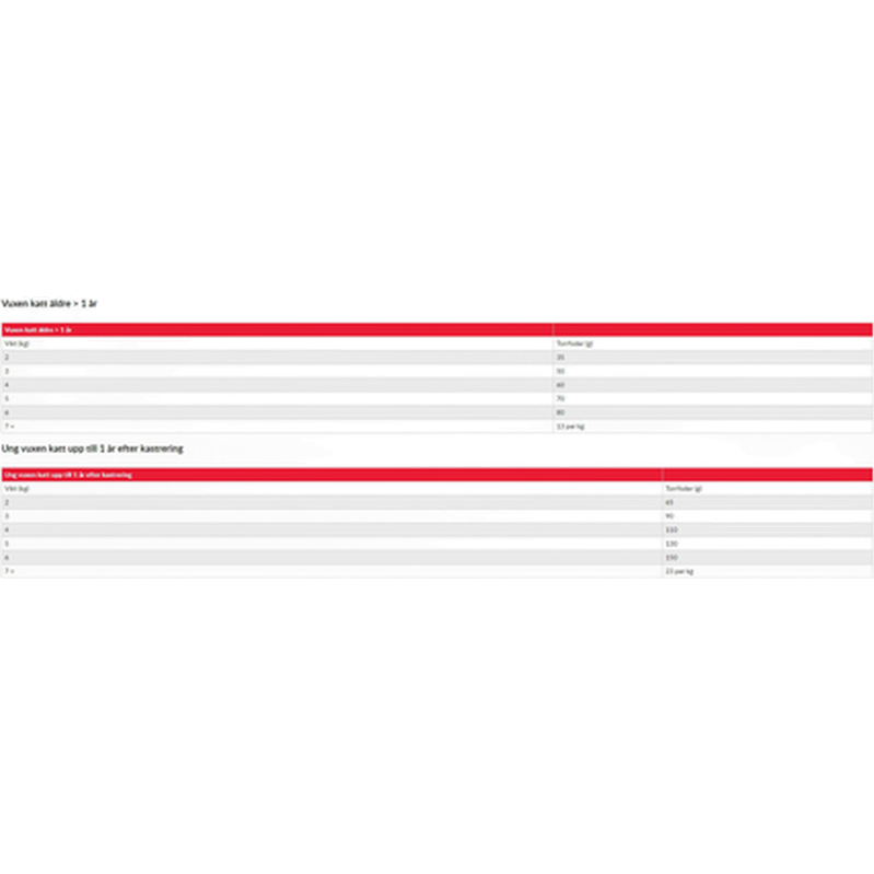 Protein 31,9%, Fettinnehåll 9,9%, Växttråd 1,2%, Råaska 5,5%, L-lysin 2,2%, Kalcium 0,83%, Fosfor 0,69%, Natrium 0,37%, Kalium 0,74%, Magnesium 0,09%; per kg: Vitamin A 7.075IE, Vitamin D3 638IE, Vitamin E 500mg, Vitamin C 85mg, Beta-karoten 1,5mg, L-karnitin 546mg.