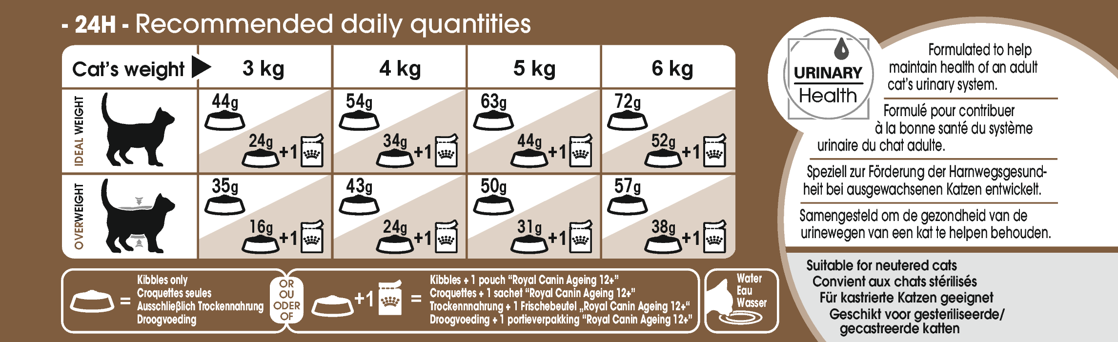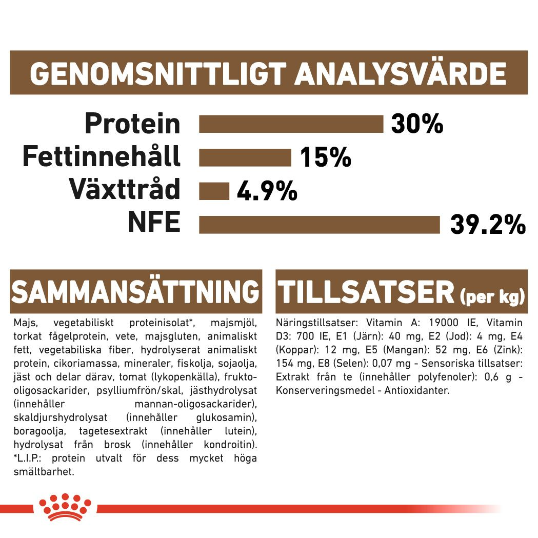 Majs, vegetabiliskt proteinisolat*, majsmjöl, torkat fågelprotein, vete, majsgluten, animaliskt fett, vegetabilisk fiber, hydrolyserat animaliskt protein, cikoriamassa, mineraler, fiskolja, sojaolja, jäst och delar därav, tomat (lykopenkälla), frukto-oligosackarider, psylliumfrön/skal, jästhydrolysat (innehåller mannan-oligosackarider), skaldjurshydrolysat (innehåller glukosamin), boragoolja, mjöl av ringblomma, hydrolysat från brosk (innehåller kondroitin).