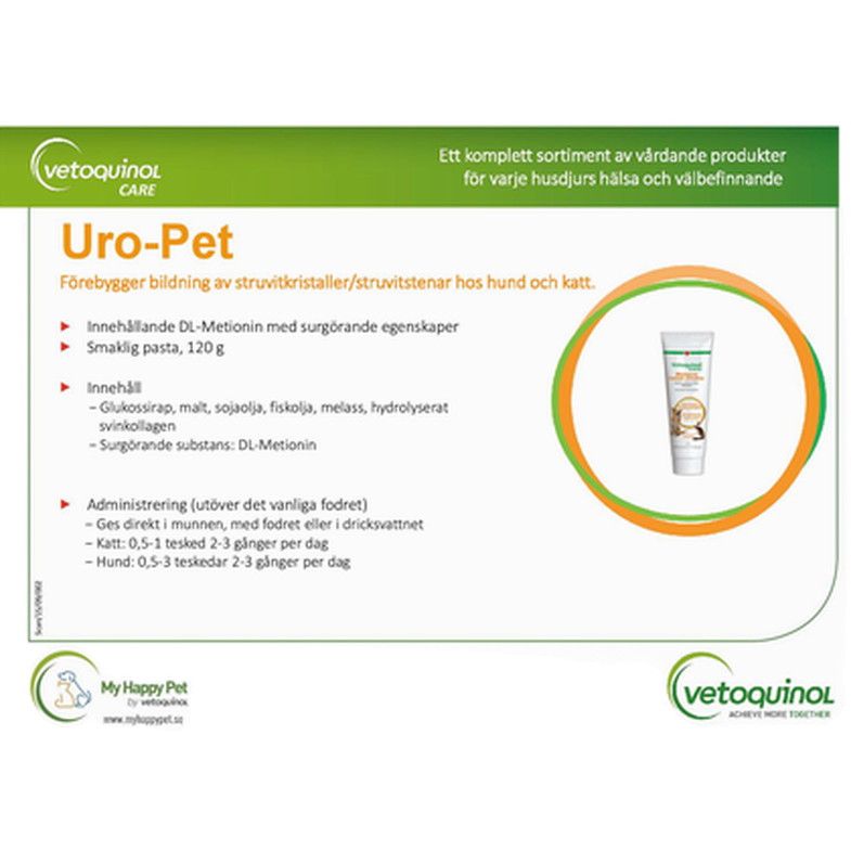 Uro-Pet kosttillskott till hund & katt förebygger bildning av struvitstenar. Vetoquinol Uro-pet innehåller DL-metionin som hjälper till att surgöra urinen. Till katter med Feline Urulogical Syndrome (FUS) & till hundar som är benägna att utvecka struvitstenar.