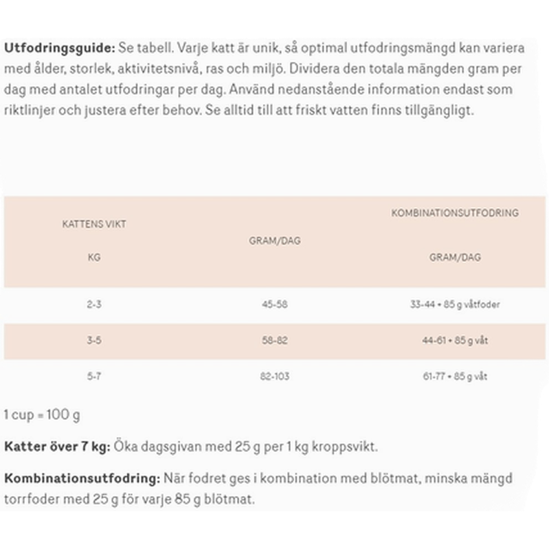Varje katt är unik, så optimal utfodringsmängd kan variera med ålder, storlek, aktivitetsnivå, ras och miljö. Dividera den totala mängden gram per dag med antalet utfodringar per dag. Använd nedanstående information endast som riktlinjer och justera efter behov. Se alltid till att friskt vatten finns tillgängligt.