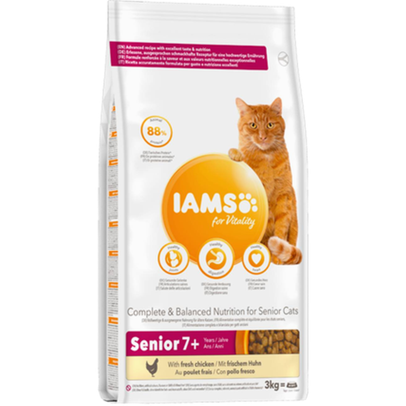 Iams Cat Senior & Mature Succulent Roast Chicken är ett torrfoder för äldre katter över 7 år. Fodret är mycket prisvärt samtidigt som det håller en hög kvalitet. Receptet är speciellt anpassat för att möta det förändrade näringsbehovet hos seniora katter. 42% kyckling & kalkon tillsammans med en låg fetthalt hjälper katten att bibehålla sin idealvikt, trots att katter ofta blir mindre aktiva med åren. Den höga smältbarheten i kombination med antioxidanter hjälper till att hålla immunförsvaret starkt. Speciella näringsämnen stödjer leder, skelett & tänder. Fiskolja håller huden frisk & främjar en vacker päls. Dessutom är foderkulorna lätta att plocka upp & tugga. Ett komplett foder för gamla katter. Utan tillsatta smakämnen, färgämnen & konserveringsmedel. Iams Cat Senior & Mature Succulent Roast Chicken