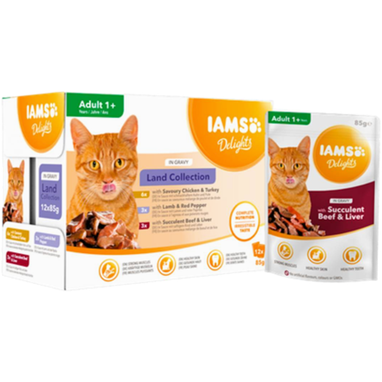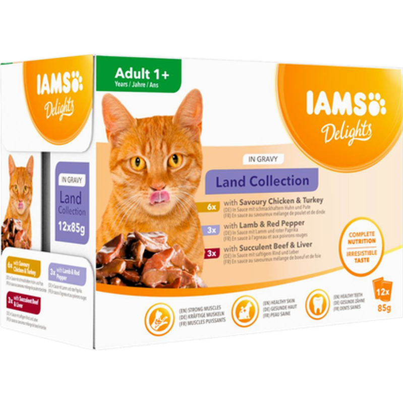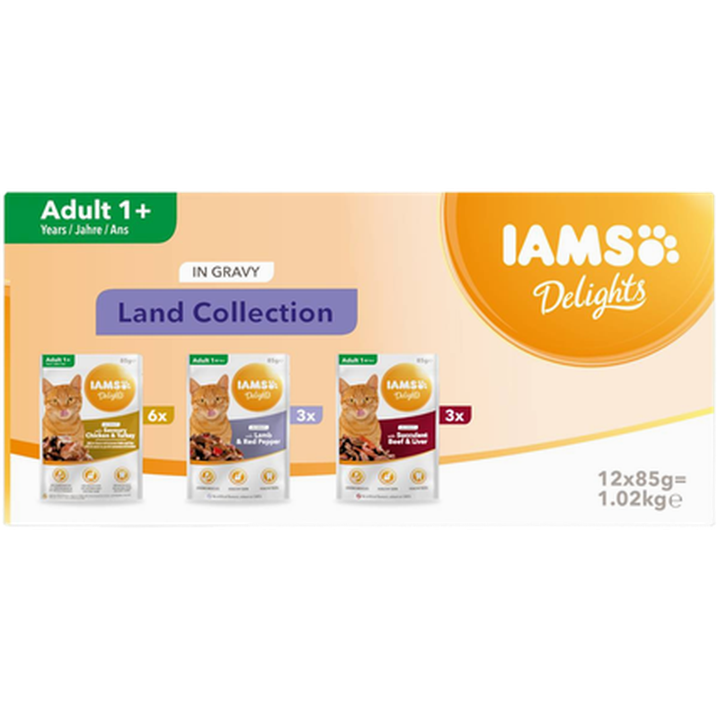 Iams Delights Köttkollektion blötmat i sås. Rekommenderas för vuxna katter över 1 år (12 månader). IAMS Delights kattfoder är ett helfoder av premiumkvalitet för den vuxna katten. Komplett näring & en oemotståndlig smak. Våtfoder med taurin som stödjer hjärtat & synen, animaliskt protein för starka muskler, mineraler för att stärka tänder & skelett, samt mineraler & vitaminer som främjar en frisk hud & blank päls. Iams Delights Multipack Land Gravy