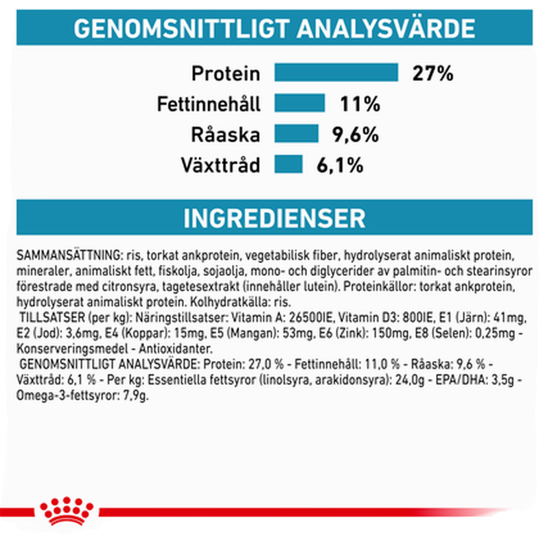 Ris, torkat ankprotein, vegetabiliska fibrer, hydrolysat av fågelprotein, mineraler, animaliskt fett, fiskolja, sojaolja, mono- och diglycerider av palmitin- och stearinsyror förestrade med citronsyra, mjöl av ringblomma. Proteinkällor: torkat ankprotein (30,8 %), hydrolysat av fågelprotein (5,4 %). Kolhydratkälla: ris (43,2 %). TILLSATSER (per kg): Näringstillsatser: Vitamin A: 31000IE, Vitamin D3: 700IE, Järn (3b103): 38mg, Jod (3b201, 3b202): 3,4mg, Koppar (3b405, 3b406): 14mg, Mangan (3b502, 3b504): 50mg, Zink (3b603, 3b605, 3b606): 147mg, Selen (3b801, 3b811, 3b812): 0,24mg - Konserveringsmedel - Antioxidanter.