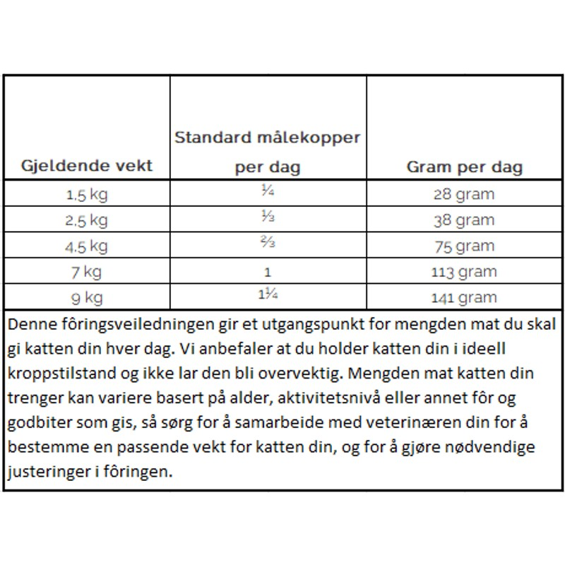 Kycklingmjöl, kyckling, slipat vitt ris, krossat pärlkorn, kornsorghum, slipat miscanthusgräs, torkad jäst, kycklingfett (konserverat med blandade tokoferoler), naturlig smak, linfrö, natriumbisulfat, kaliumklorid, DL-metionin, kolinklorid, taurin, torkad cikoriarot, grönkål, chiafrön, pumpa, blåbär, apelsiner, quinoa, torkad kelp, kokosnöt, spenat, morötter, papaya, yucca schidigera-extrakt, torkad fermenteringsprodukt av Lactobacillus plantarum, torkad fermenteringsprodukt av Bacillus subtilis, torkad fermenteringsprodukt av Lactobacillus acidophilus, torkad fermenteringsprodukt av Enterococcus faecium, torkad fermenteringsprodukt av Bifidobacterium animalis, zinkproteinat, E-vitamintillskott, niacin, manganproteinat, kopparproteinat, zinksulfat, mangansulfat, kopparsulfat, tiaminmononitrat, vitamin A-tillskott, biotin, kaliumjodid, kalciumpantotenat, riboflavin, pyridoxinhydroklorid, vitamin B12-tillskott, natriumselenit, vitamin D3-tillskott, folsyra.