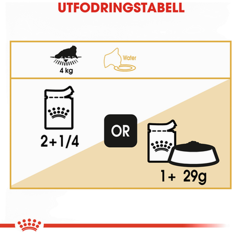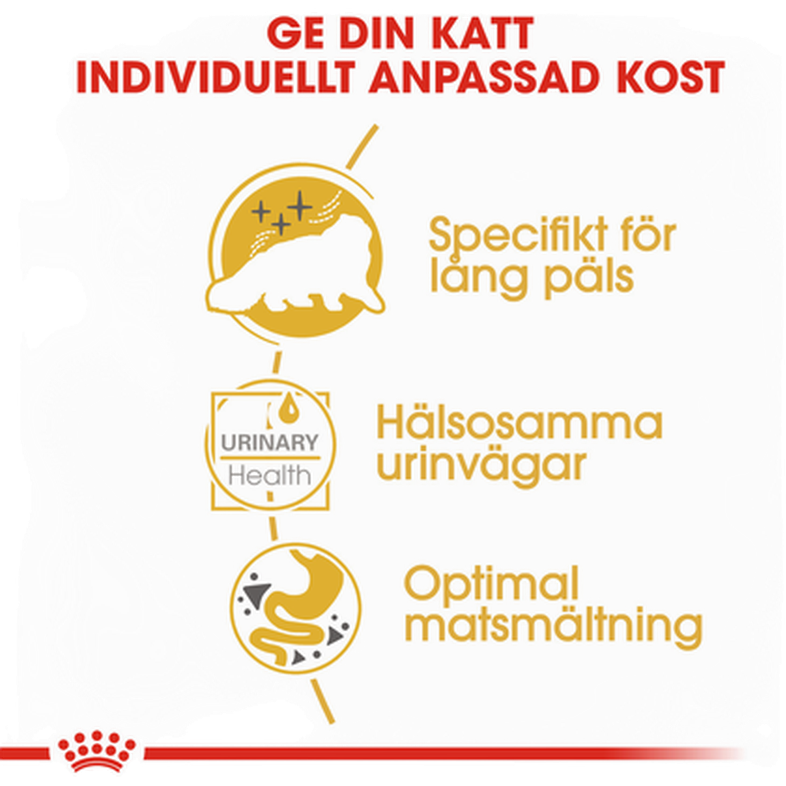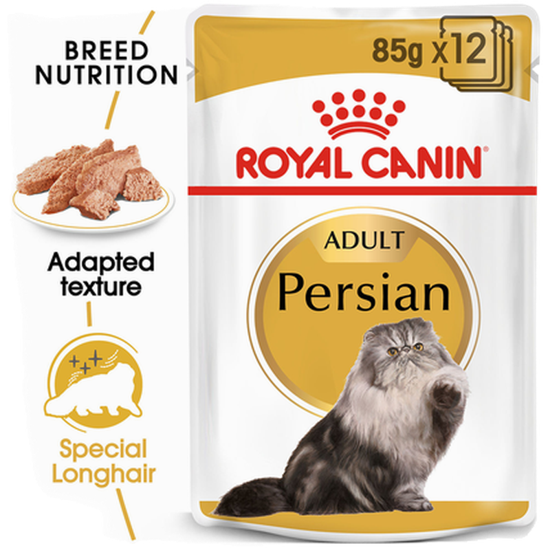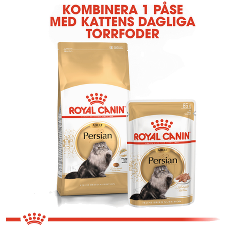Royal Canin® Persian Adult våtfoder innehåller en speciell, exklusiv näringsprofil som bidrar till att stödja hudens skyddande roll för att bibehålla hälsosam hud och blank långhårig päls. Royal Canin Persian Adult paté har utformats med en delikat och anpassad konsistens för optimal smaklighet. Den hjälper också till att främja matsmältningen med en mängd mycket smältbara proteiner och en speciell blandning av kostfibrer, tillsammans med en specifikt anpassad vitamin- och mineralhalt. För att tillgodose alla katters individuella preferenser finns Royal Canin® Persian Adult också som torrfoder med krispiga och välsmakande foderbitar.