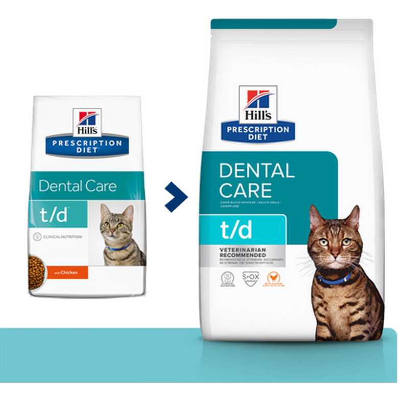 Hills torrfoder med kyckling för vuxna katter med tandstensproblem. Veterinärfoder Hills katt t/d Dental Health dietfoder med kyckling, fiberrikt kattfoder som förbättrar munhälsan, tar bort tandsten, plack & missfärgningar. Hills Prescription Diet Feline t/d Dental Health ges på rekommendation av veterinär.