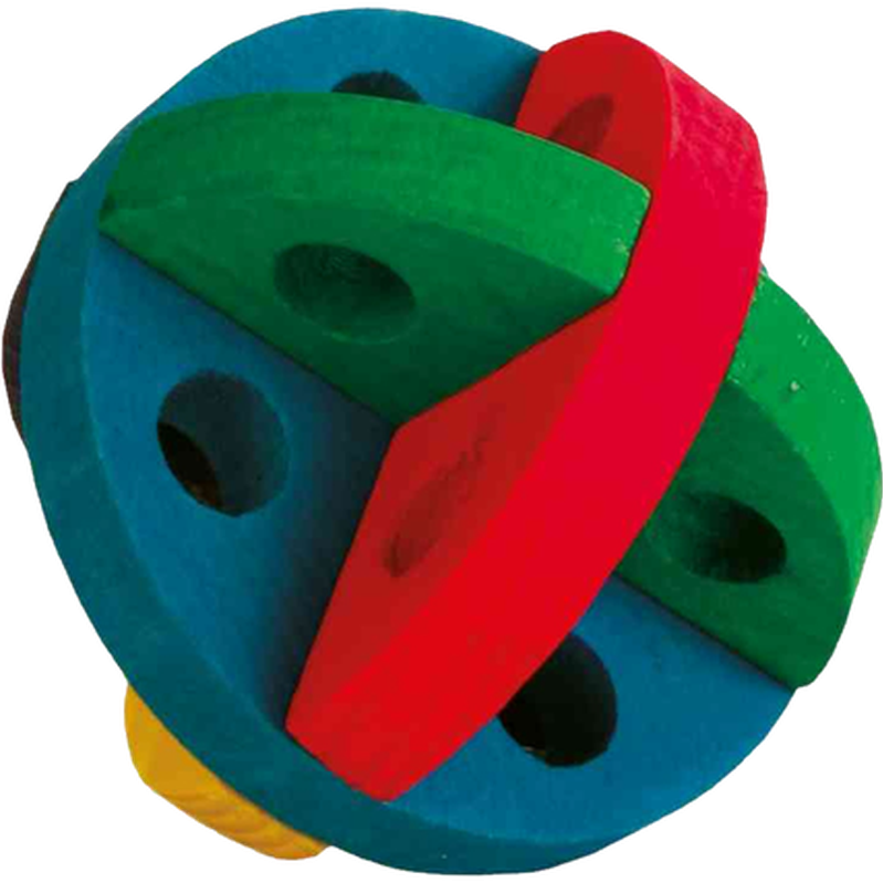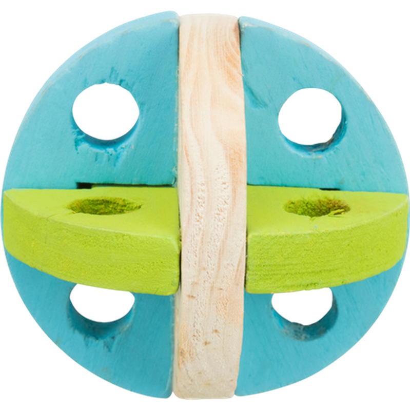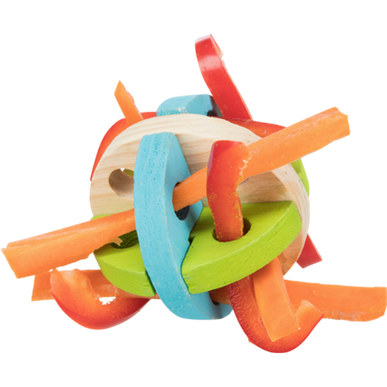 Träleksak till smådjur med spännande pingla inuti. Rolig aktiveringsleksak som kan fyllas med godsaker, rullas, puttas eller bäras av kanin, marsvin, hamster & leksugna gnagare. Berika smådjursburen med gnagvänliga leksaker. Trixie Play & Snack Ball with bell.