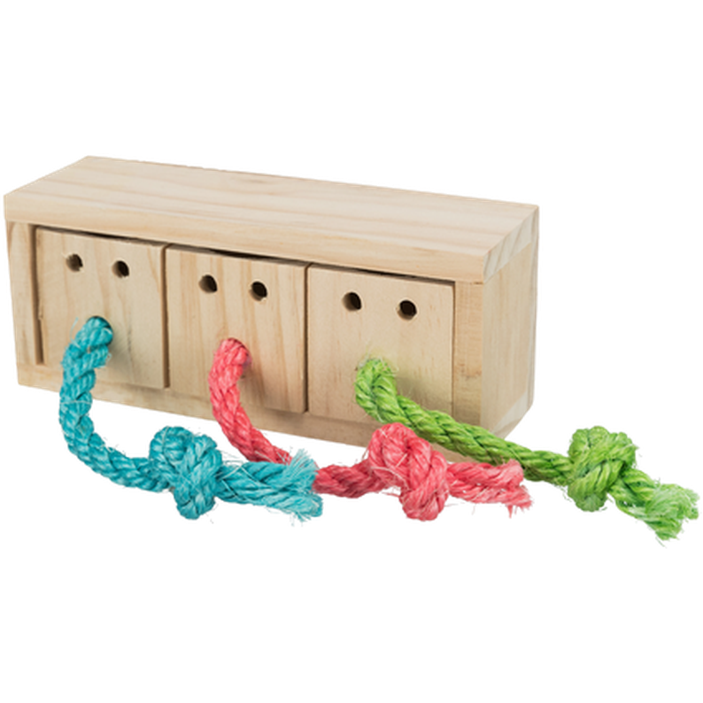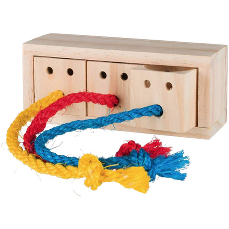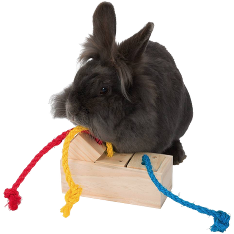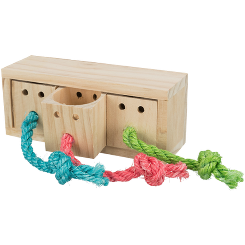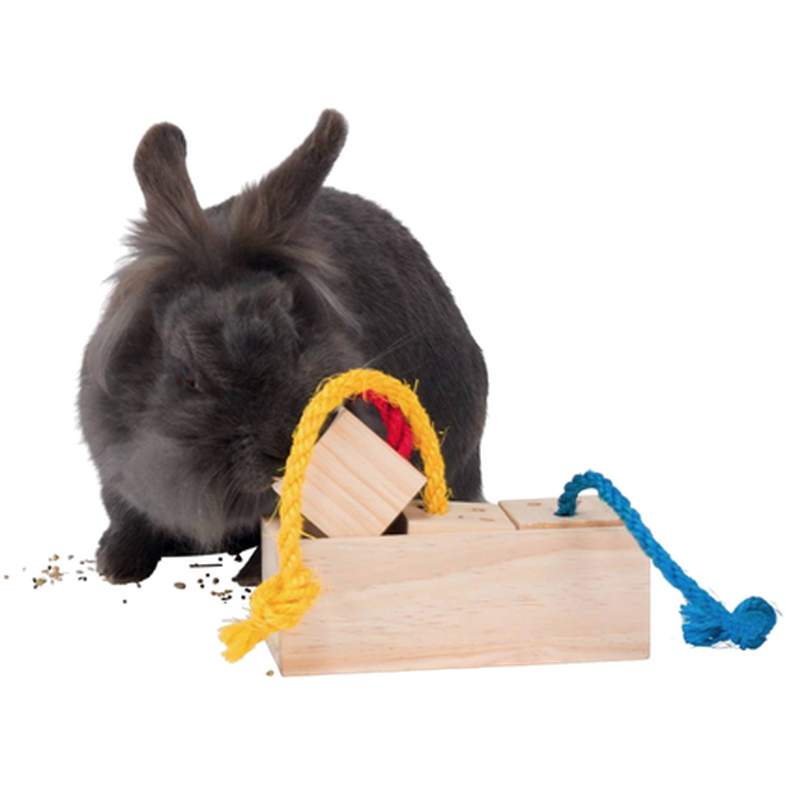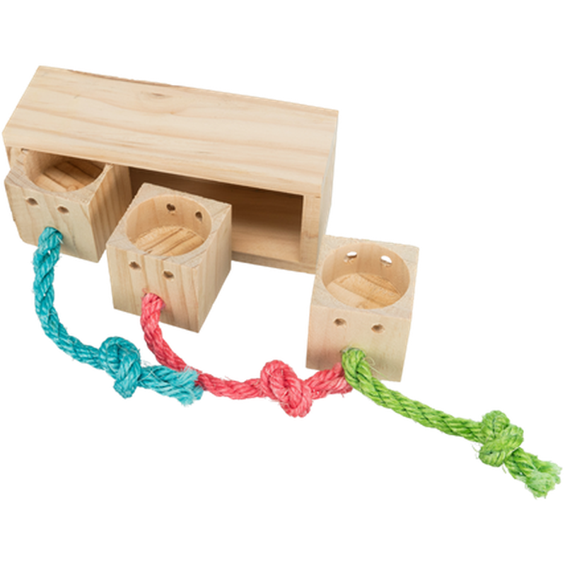 Mental stimulering för kaniner & gnagare. Aktiveringsleksak som kan användas för att gömma husdjurets mat, grönsaker, frukt, foder eller godsaker. Genom att dra i sisalkablarnarepen öppnas kuberna & smådjursgodiset exponeras. Passar även katter & små hundar.